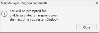 Cause: Authentication with the Sharepoint email storage location has expired and needs to be refreshed.